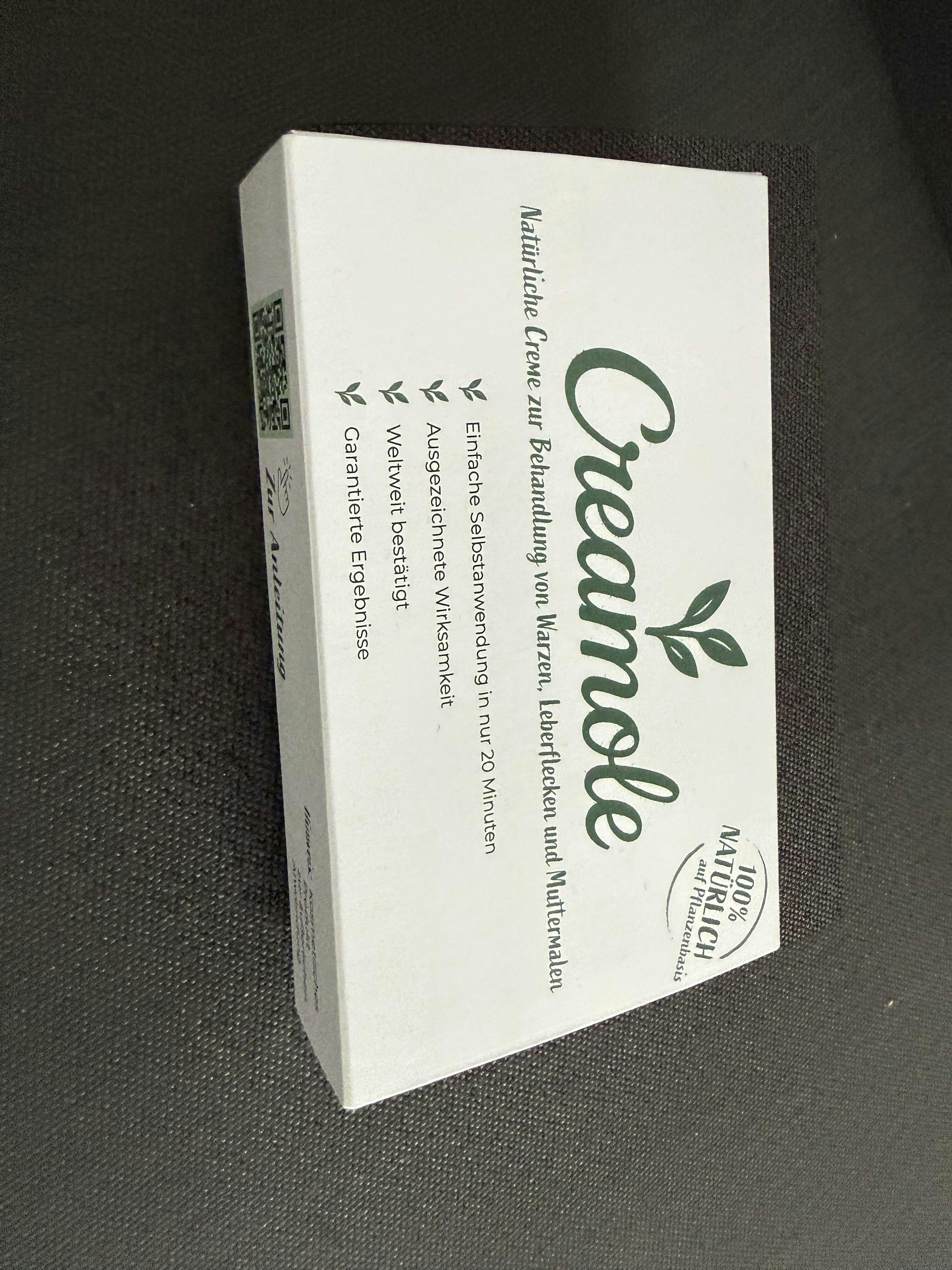 Creamole ist für die ästhetische Anwendung bei Muttermalen & Co. entwickelt. Pflanzliche Wirkstoffe trocknen die Stelle gezielt aus – bereits eine Anwendung genügt. Es bildet sich eine Kruste, die sich von selbst löst – so entfernst du Muttermale, Warzen oder Hautanhängsel sanft und ohne Laser.