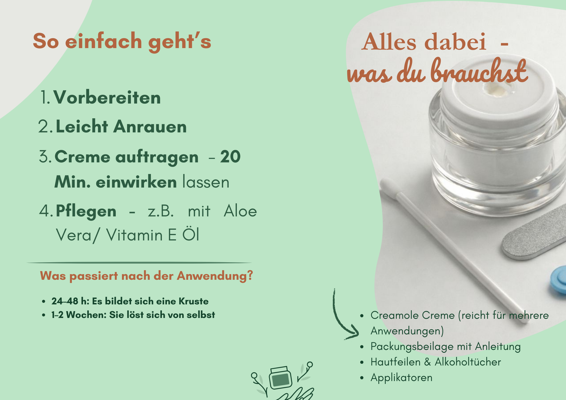 Nach der einmaligen Anwendung löst sich die Kruste nach 7–14 Tagen – je nach Hauttyp und Stelle kann es etwas früher oder später sein.